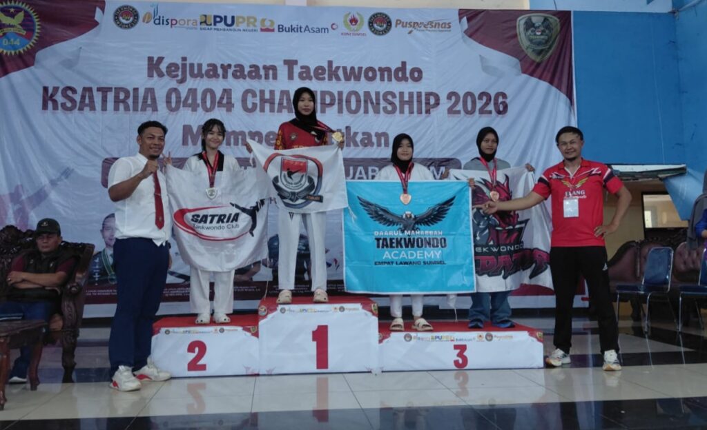 KLIKEMPATLAWANG.ID, Empat Lawang – Prestasi membanggakan kembali ditorehkan oleh Tim Taekwondo Elang DMTA yang berhasil meraih juara 3 dalam ajang Kejuaraan Piala Dandim 0404 yang digelar di GOR Pancasila, Muara Enim, Sumatera Selatan, pada 12 April 2026.
